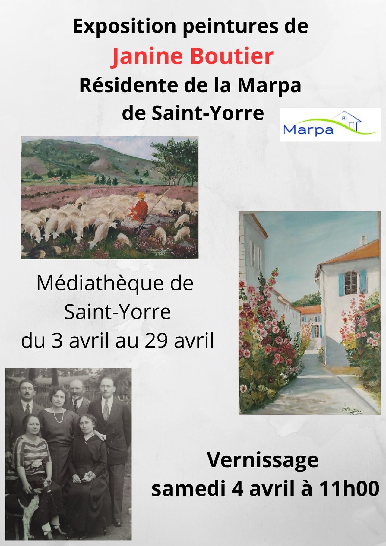 Mme Boutier (96 ans), résidente de la Marpa de Saint-Yorre, expose pour la 1ère fois quelques-unes de ses oeuvres. Elle puise son inspiration dans des photos, des magazines ou des revues de presse depuis une trentaine d'années.